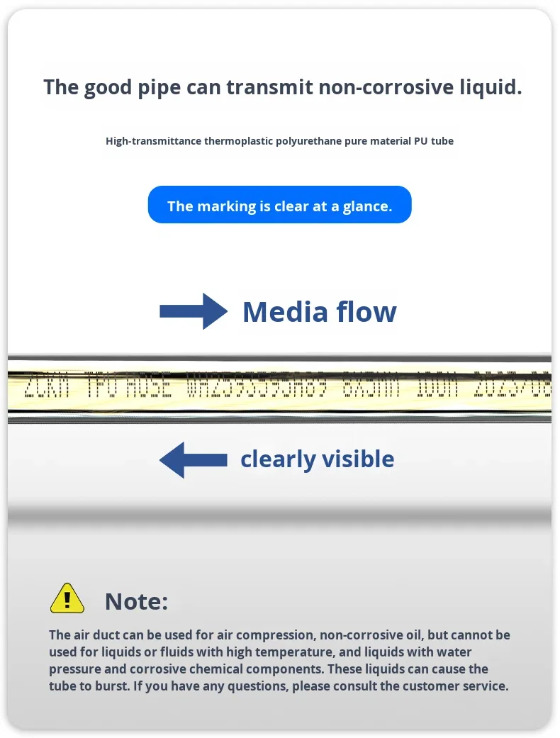 The surface of PU hoses has high wear resistance, which can resist friction and collision with mechanical equipment and workpieces in industrial environments; it also has good resistance to oil mist and chemical corrosion, and is not easy to age or deteriorate when exposed to common industrial media, ensuring long-term stable operation of the pneumatic system.