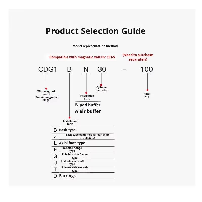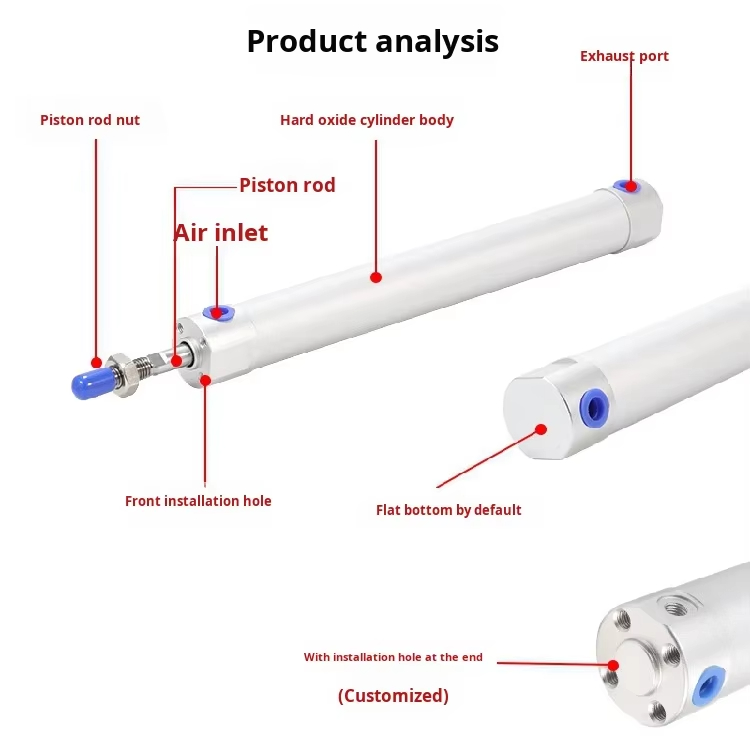 The stroke of the cylinder can be customized according to production requirements (e.g., short strokes for handling small injection-molded parts, long strokes for moving large workpieces). Combined with accessories such as magnetic switches, it can precisely control the start and end positions of lifting and lowering, ensuring high repeat positioning accuracy.