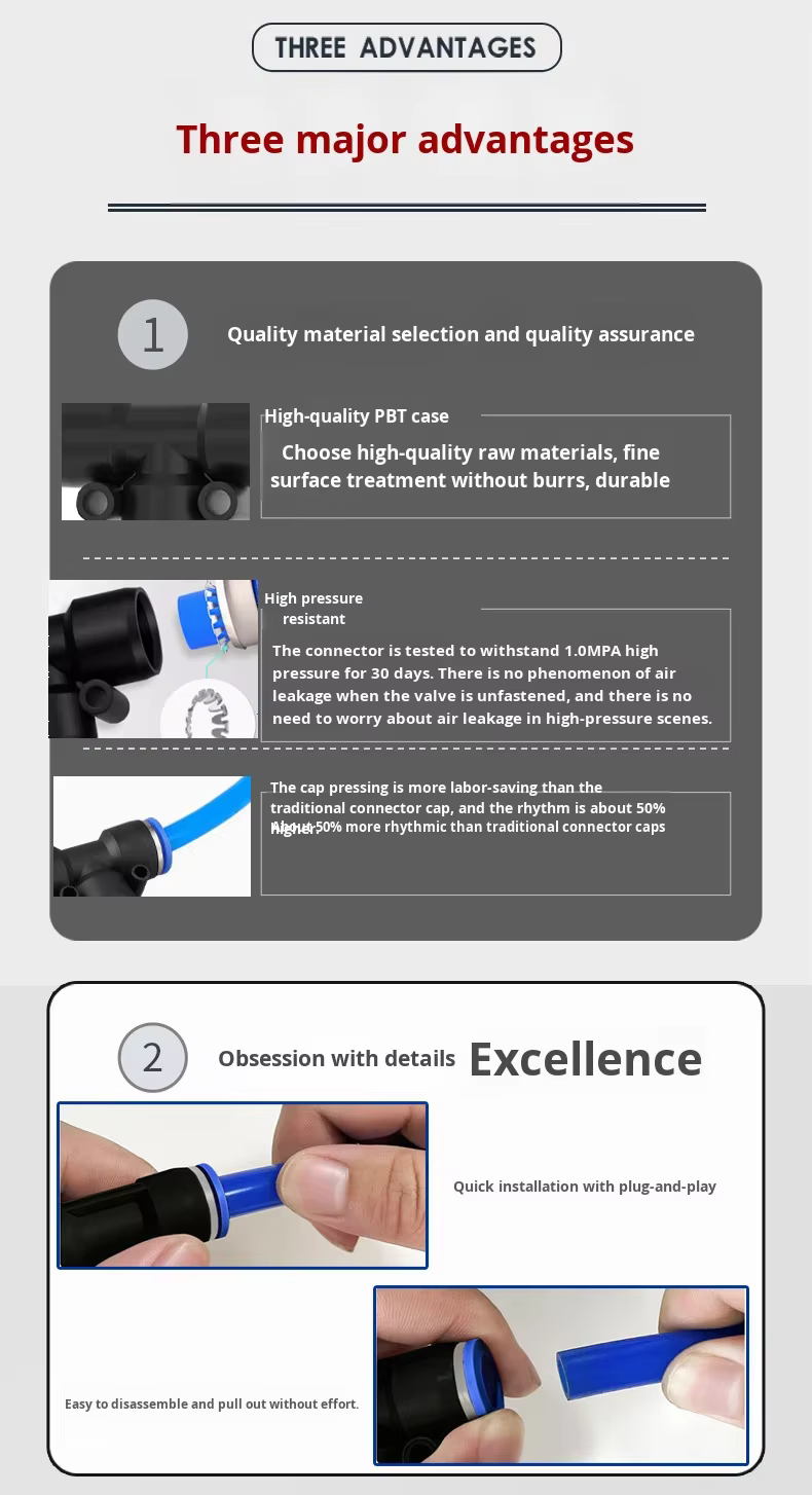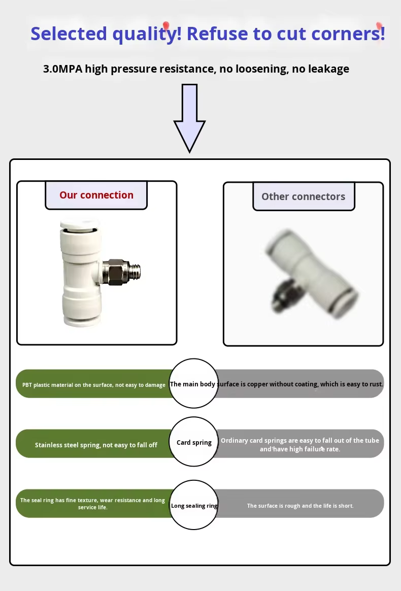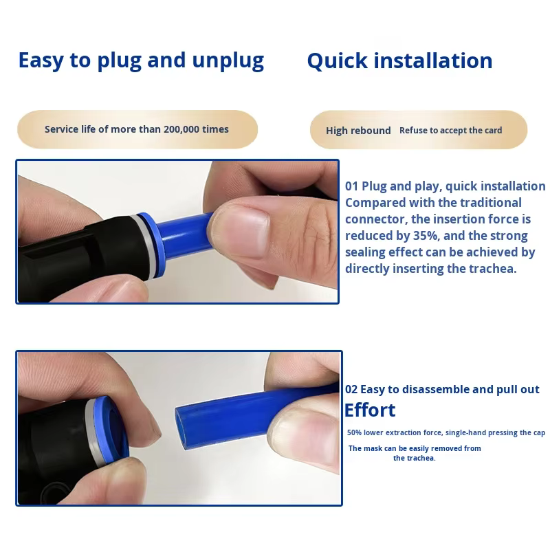 2. Quick Assembly and Disassembly ConnectionAdopting a push-in design, it allows manual insertion or removal of polyurethane and nylon air hoses without additional tools, enabling efficient installation and disassembly and significantly reducing the time cost of pipeline assembly and maintenance. Moreover, the fitting can rotate 360° freely, allowing flexible adjustment of pipeline direction after installation and adapting to pipeline routing needs in confined spaces.