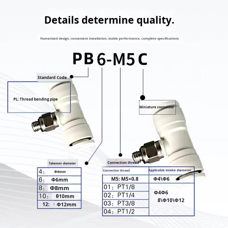 1. Accessory InspectionConfirm that the fitting model matches the applicable air hose specifications (e.g., PB4 is compatible with 4mm air hoses) and threaded interfaces (such as M5/R1/8). Check that the fitting’s seals (sealing rings, gaskets) are intact, the sealant on the threaded parts is uniform and free of defects, and the locking clips are free from deformation or loosening.