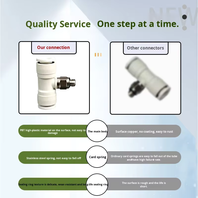 1. Pipeline Flow Distribution and ConfluenceWith its T-shaped structure, the fitting can either split a single path of fluid (such as compressed air or water) into two paths for delivery, meeting the air/water supply needs of multiple actuators; it can also merge two paths of fluid into one for transmission, adapting to the fluid deployment requirements of different pipeline layouts and ensuring the flexibility of fluid delivery.
